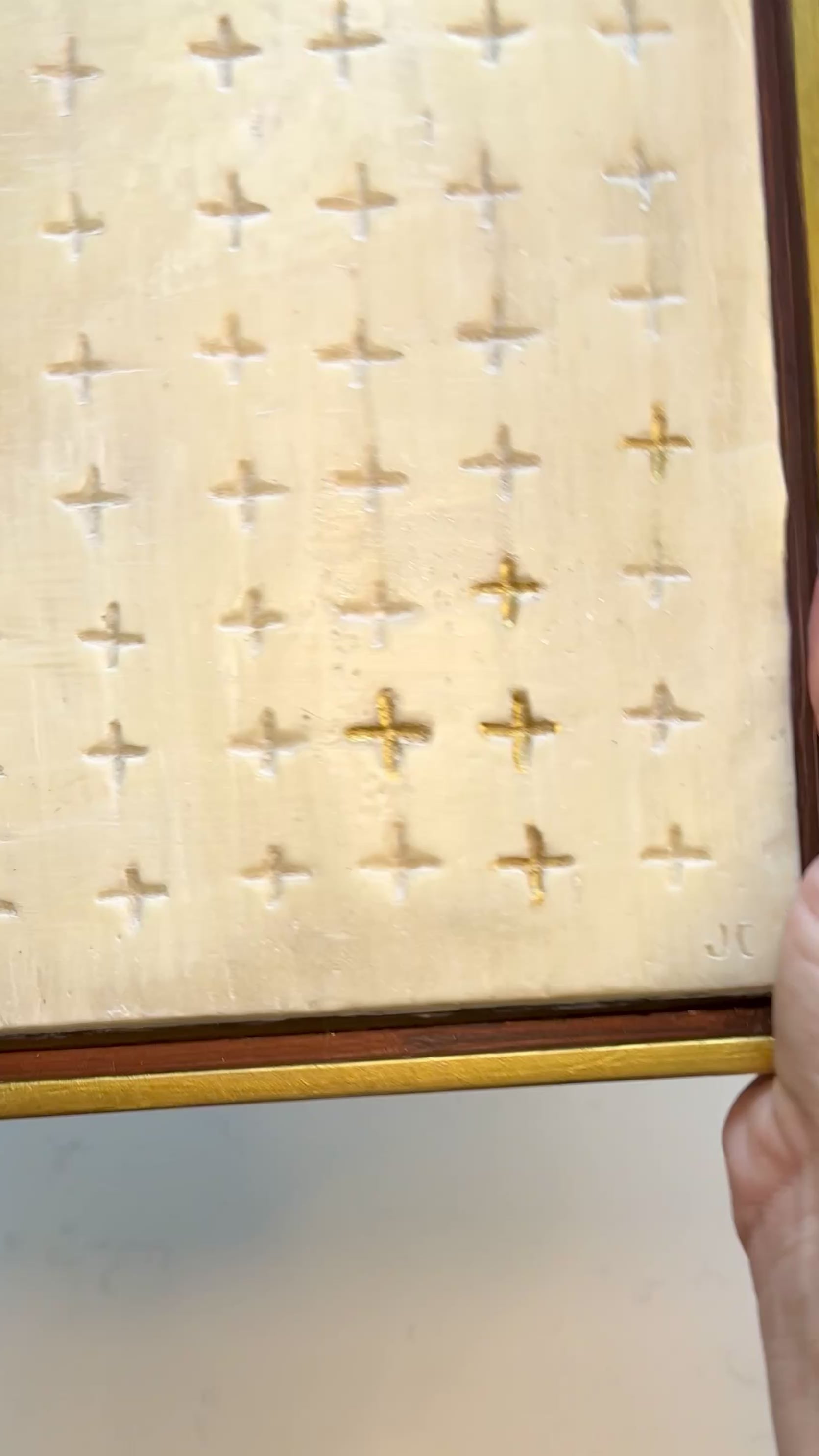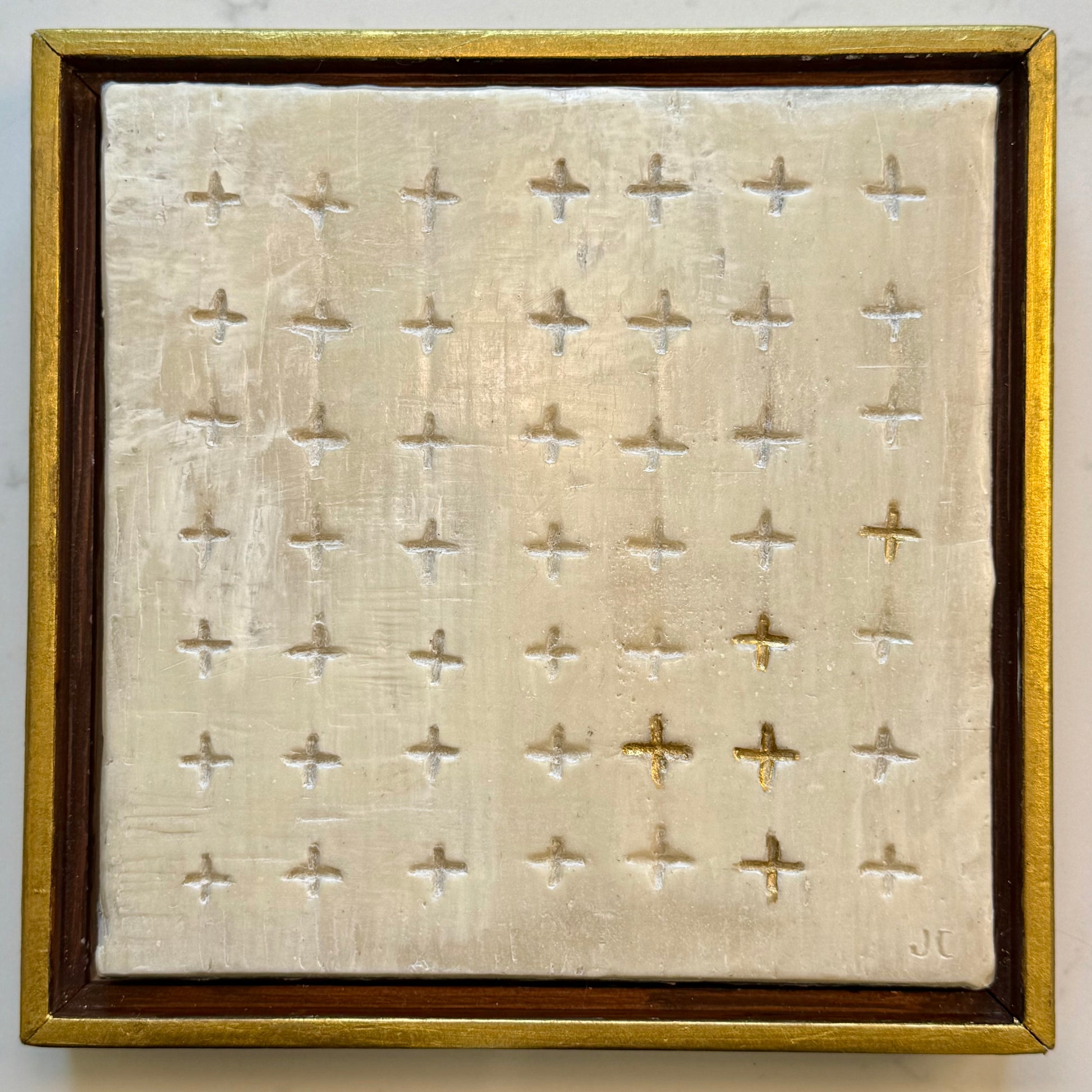 This original 8x8 encaustic wax painting is a quiet study in light and repetition. An ivory, luminous surface hand carved with a grid of small cross marks, 5 crosses filled with gold leaf. Presented in a wood gold frame.