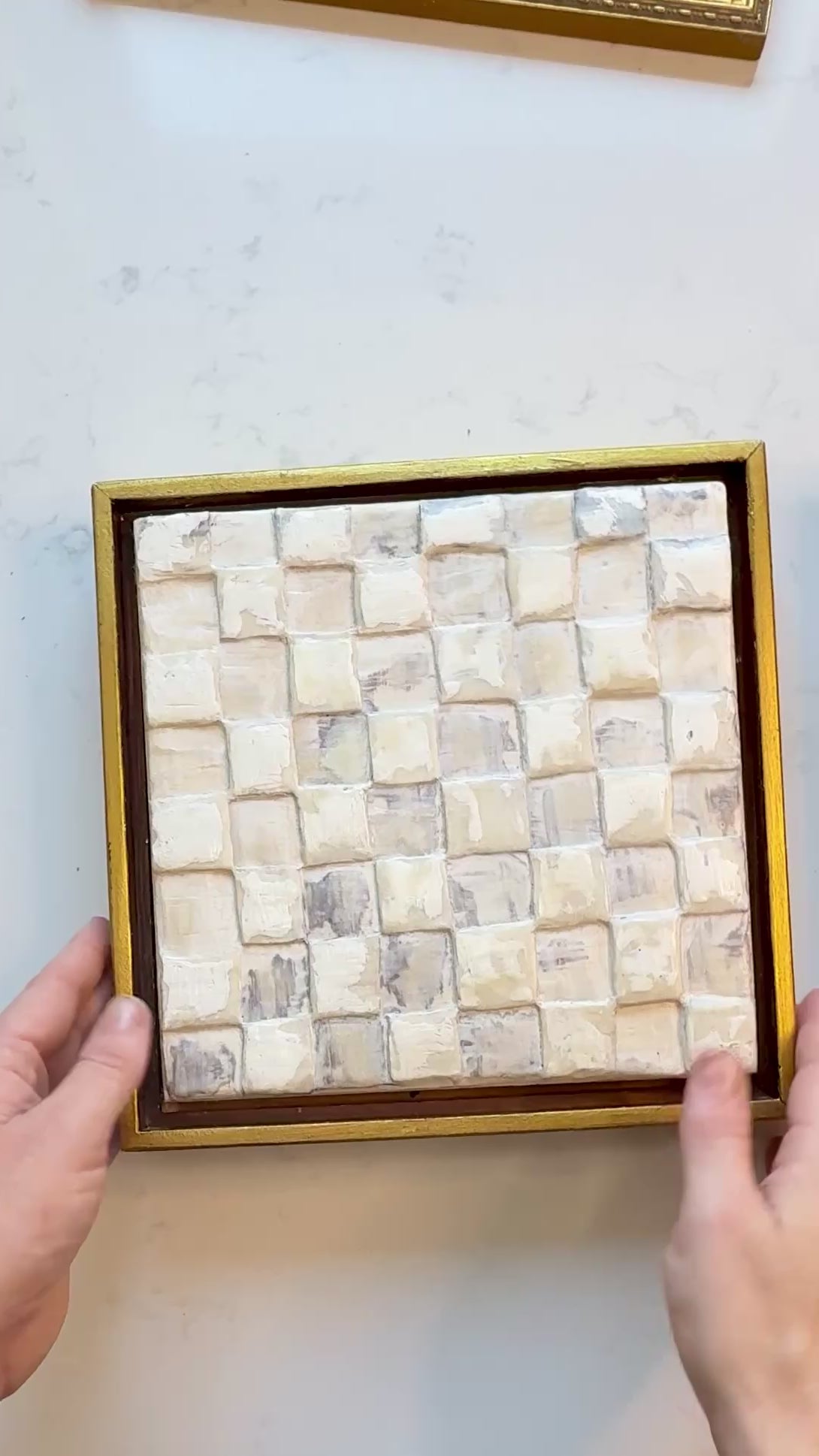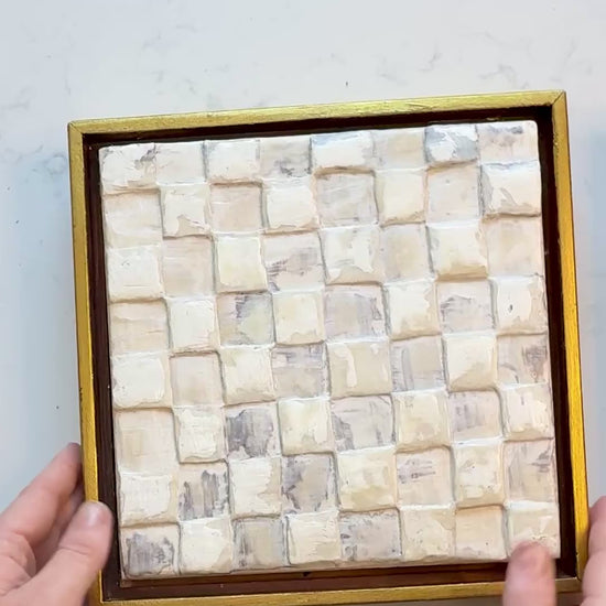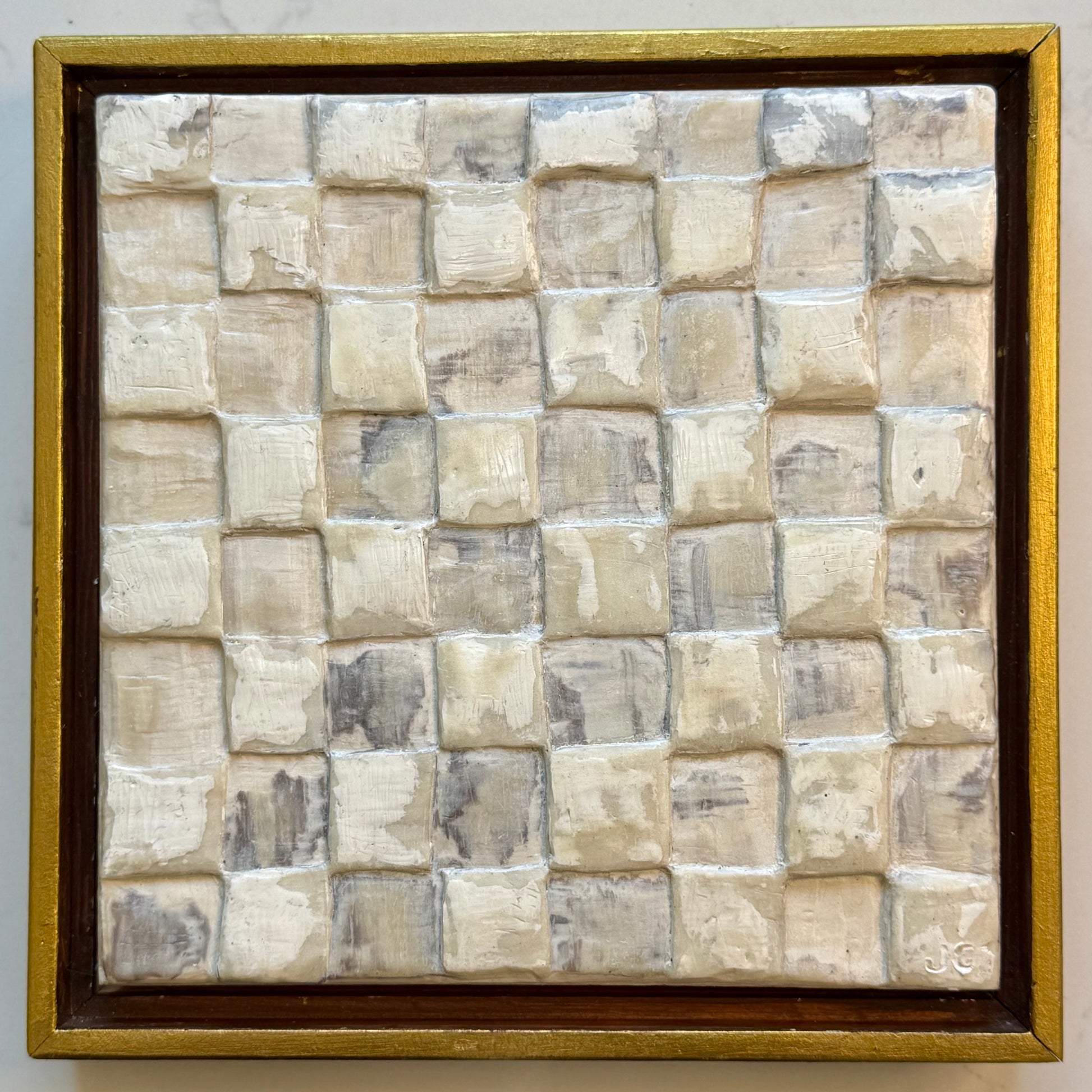 This original 8x8 encaustic wax painting is a soft, sculptural checker-grid built from hand carved square tiles in creamy ivory, taupe, and smoky gray. Each block is carved in wax, creating gentle shadows and a checkered rhythm that changes with the light. Calm, neutral, and textural. Finished in a gold frame.