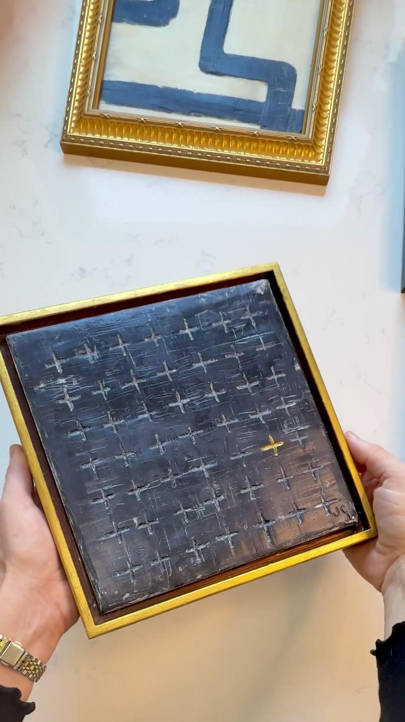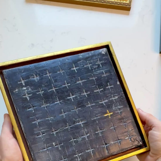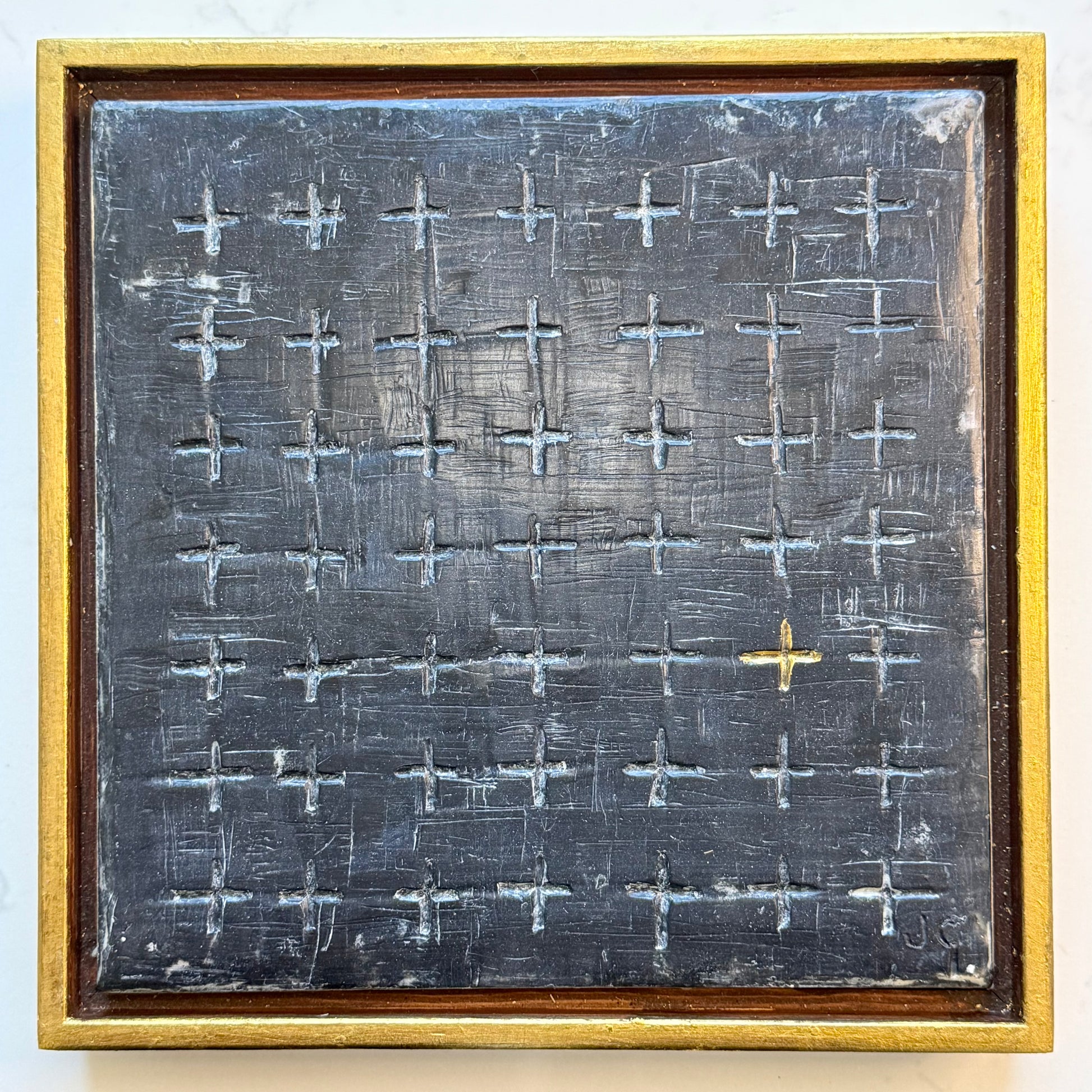 This original 8x8 encaustic wax painting is a moody, midnight-toned grid. An inky charcoal/black surface carved with a repeating field of small cross marks. The wax holds every scrape, line, and softened edge, creating a weathered, tactile depth that shifts with the light. One single gold cross filled with gold leaf, like a small moment of hope inside the dark.