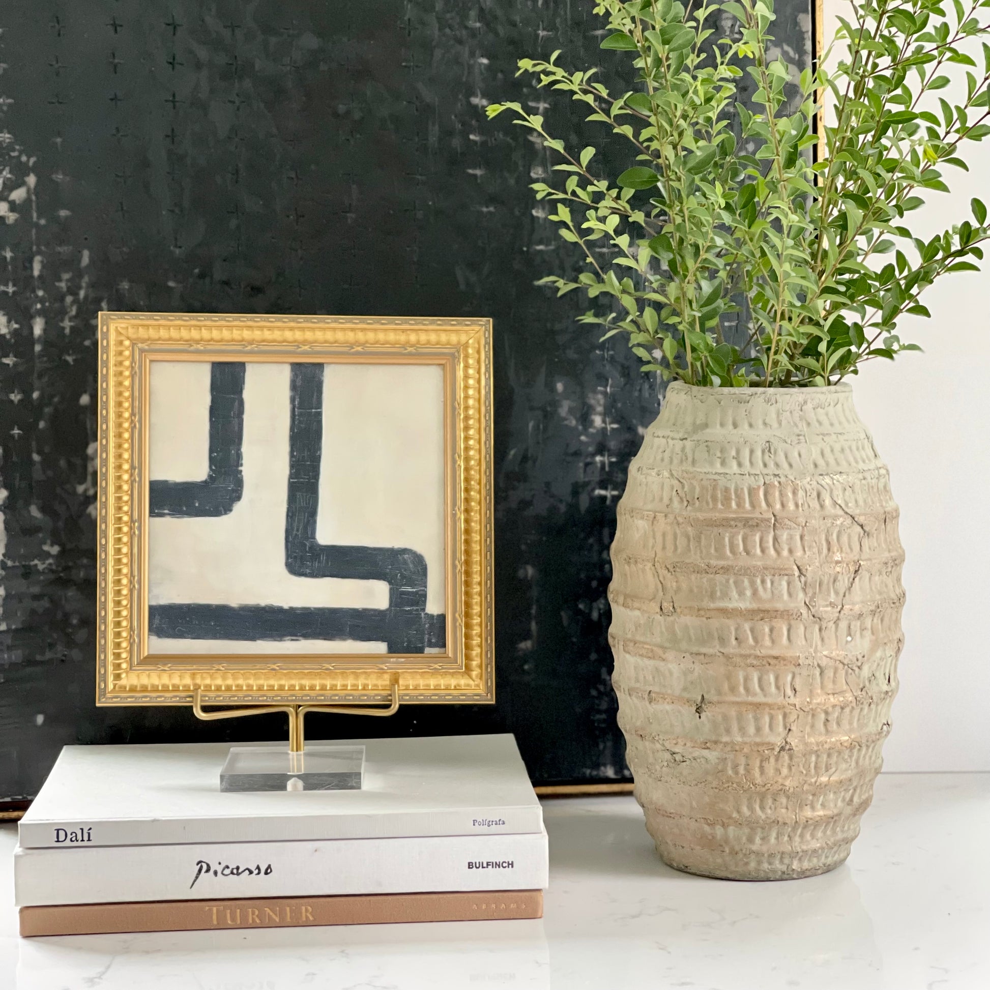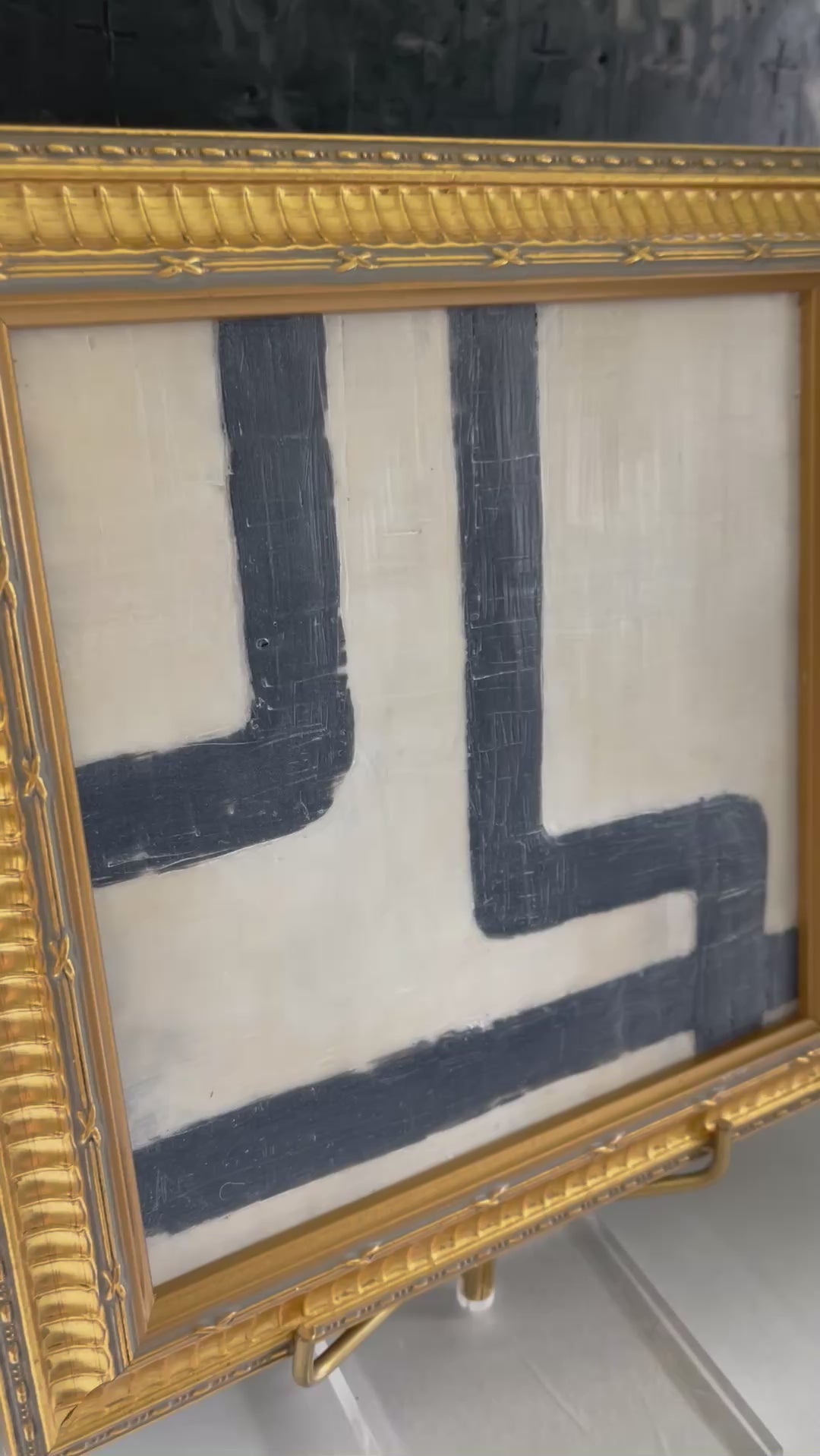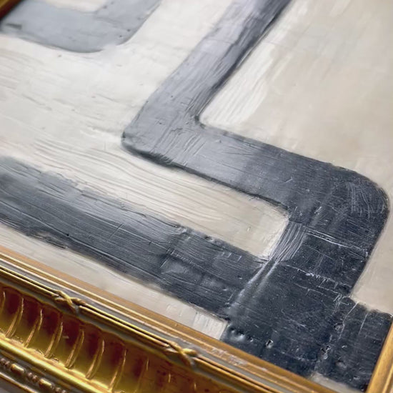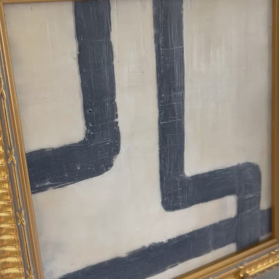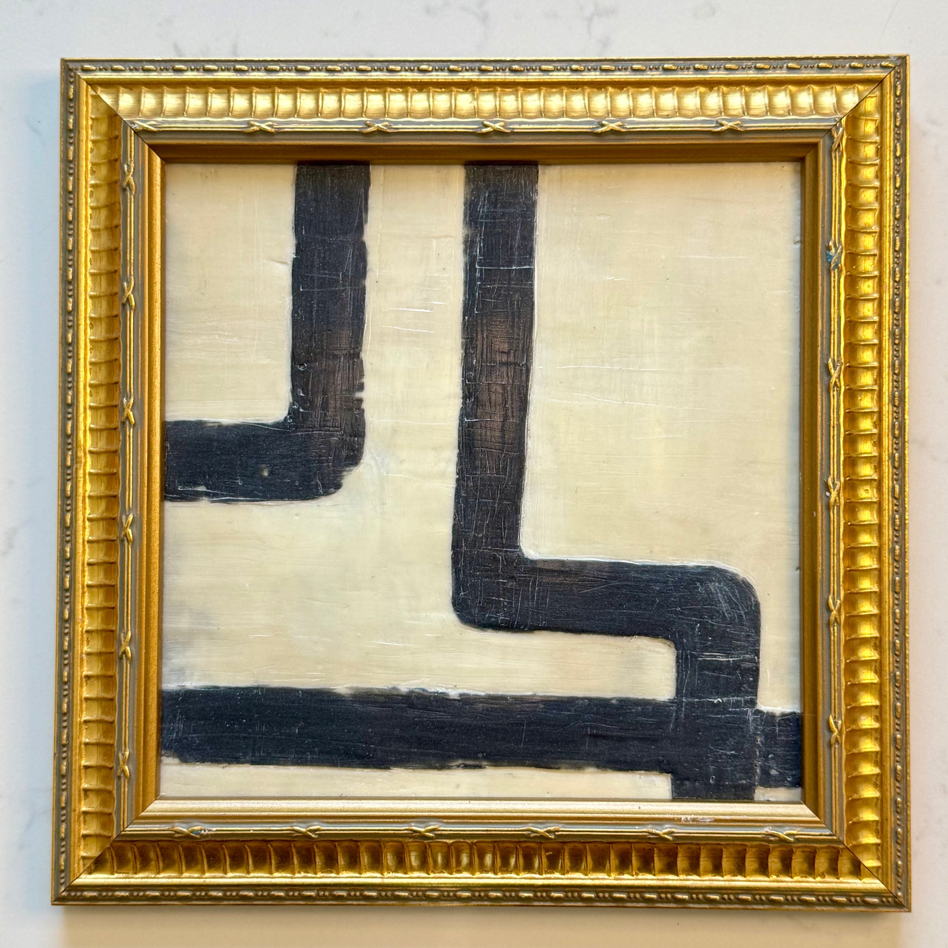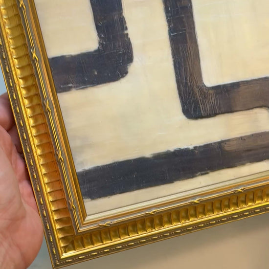 This original 8x8 encaustic wax painting pairs bold, inky-black geometric lines with a warm ivory/cream ground. Presented in a richly detailed ornate gold frame.