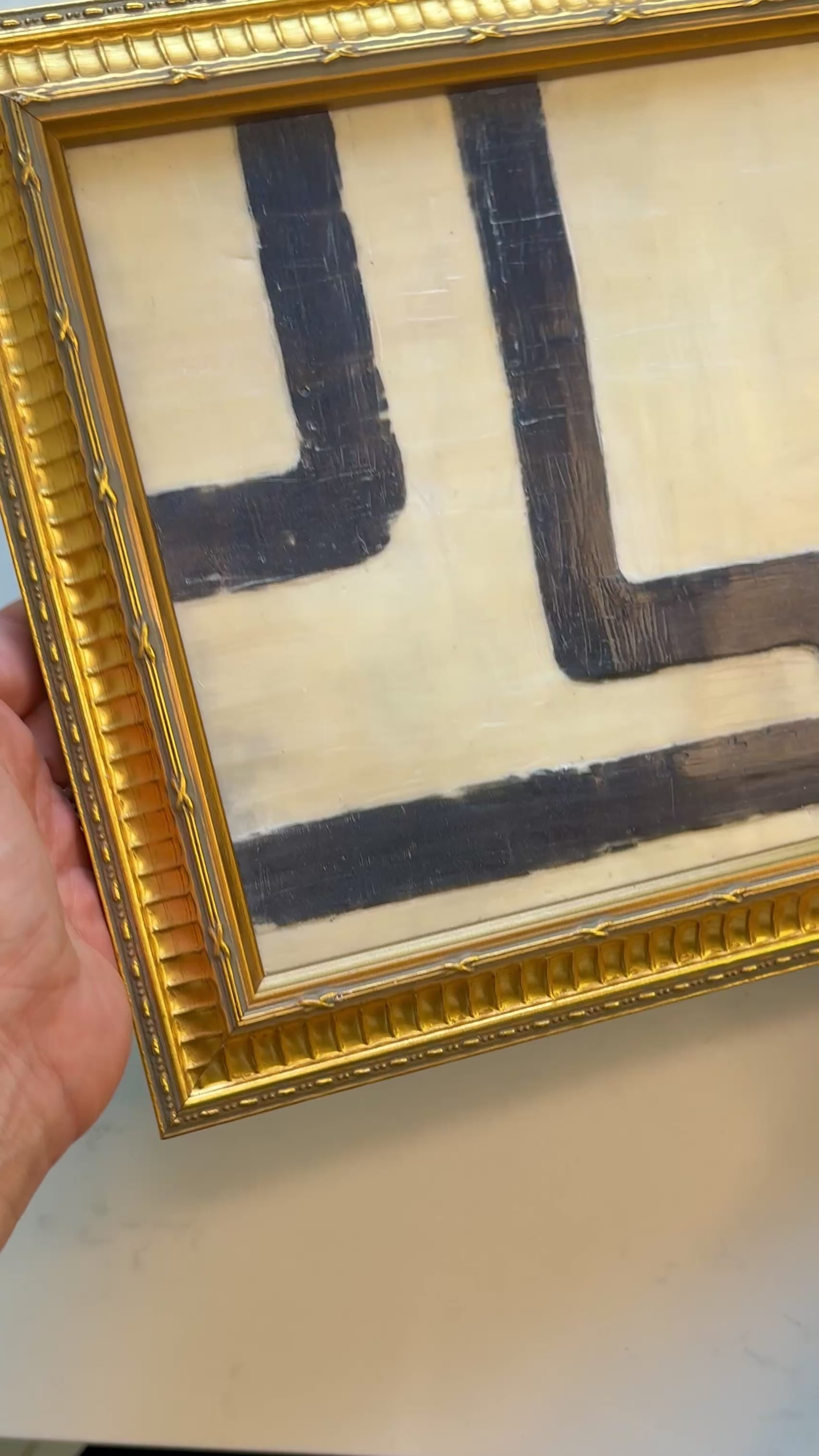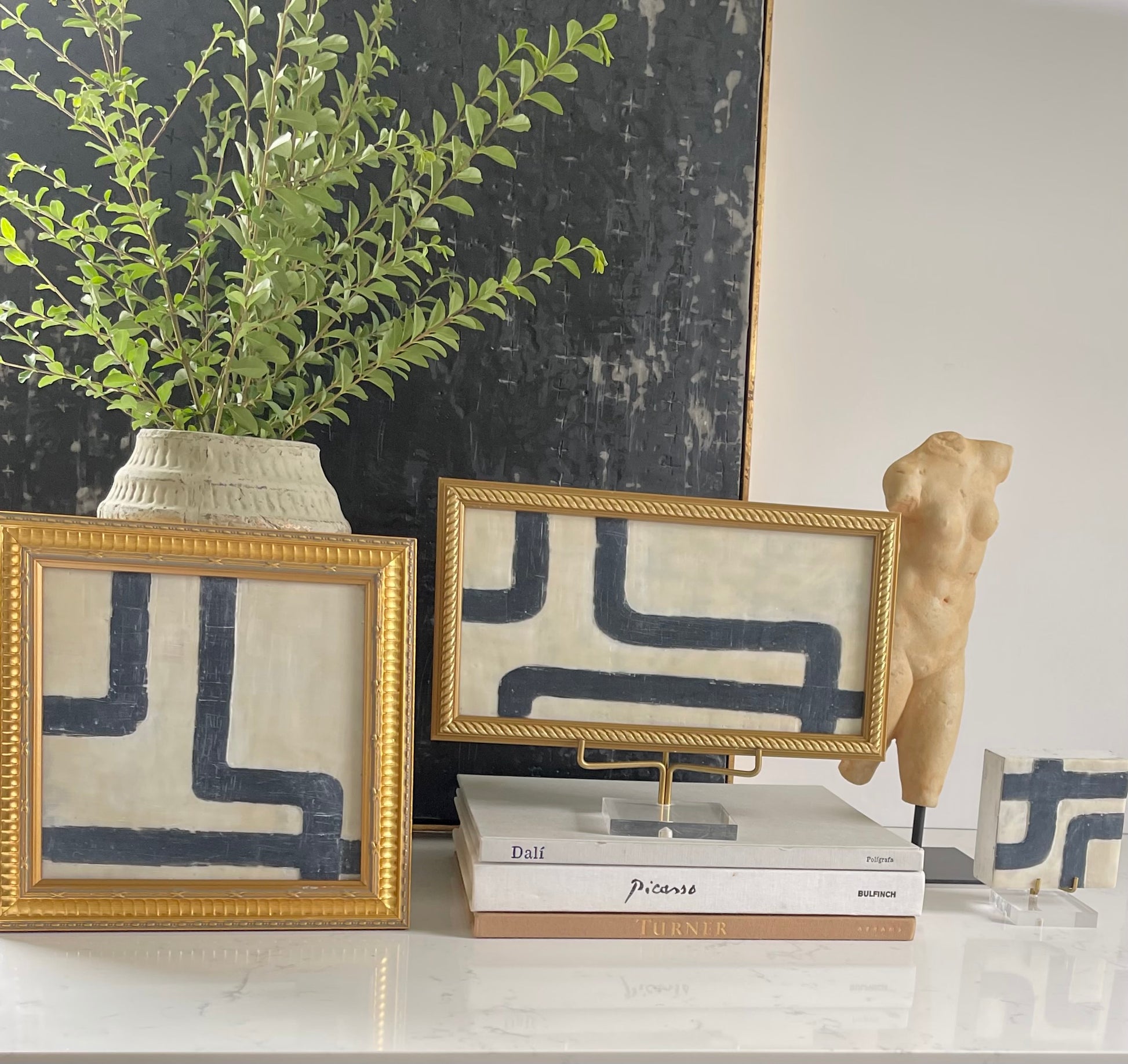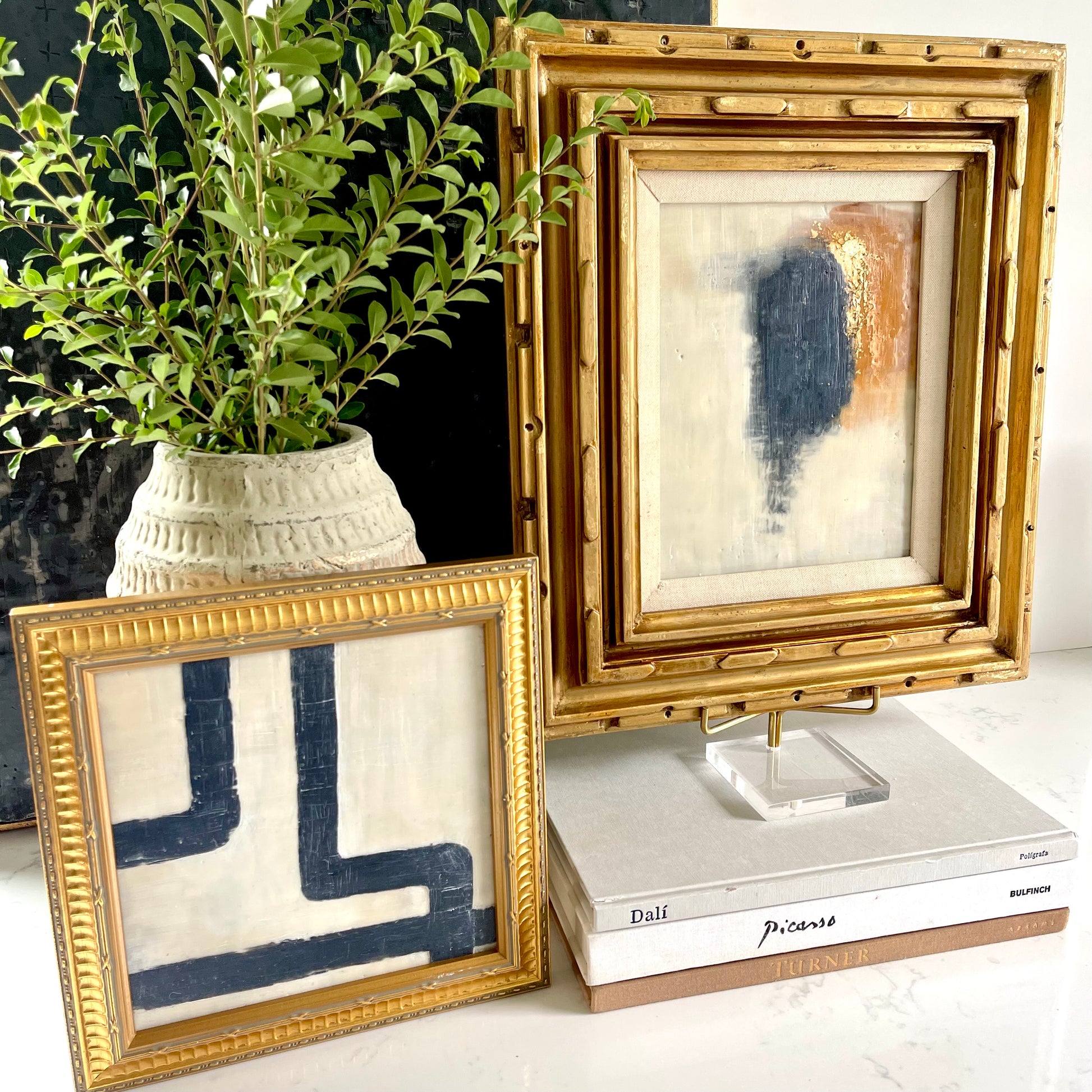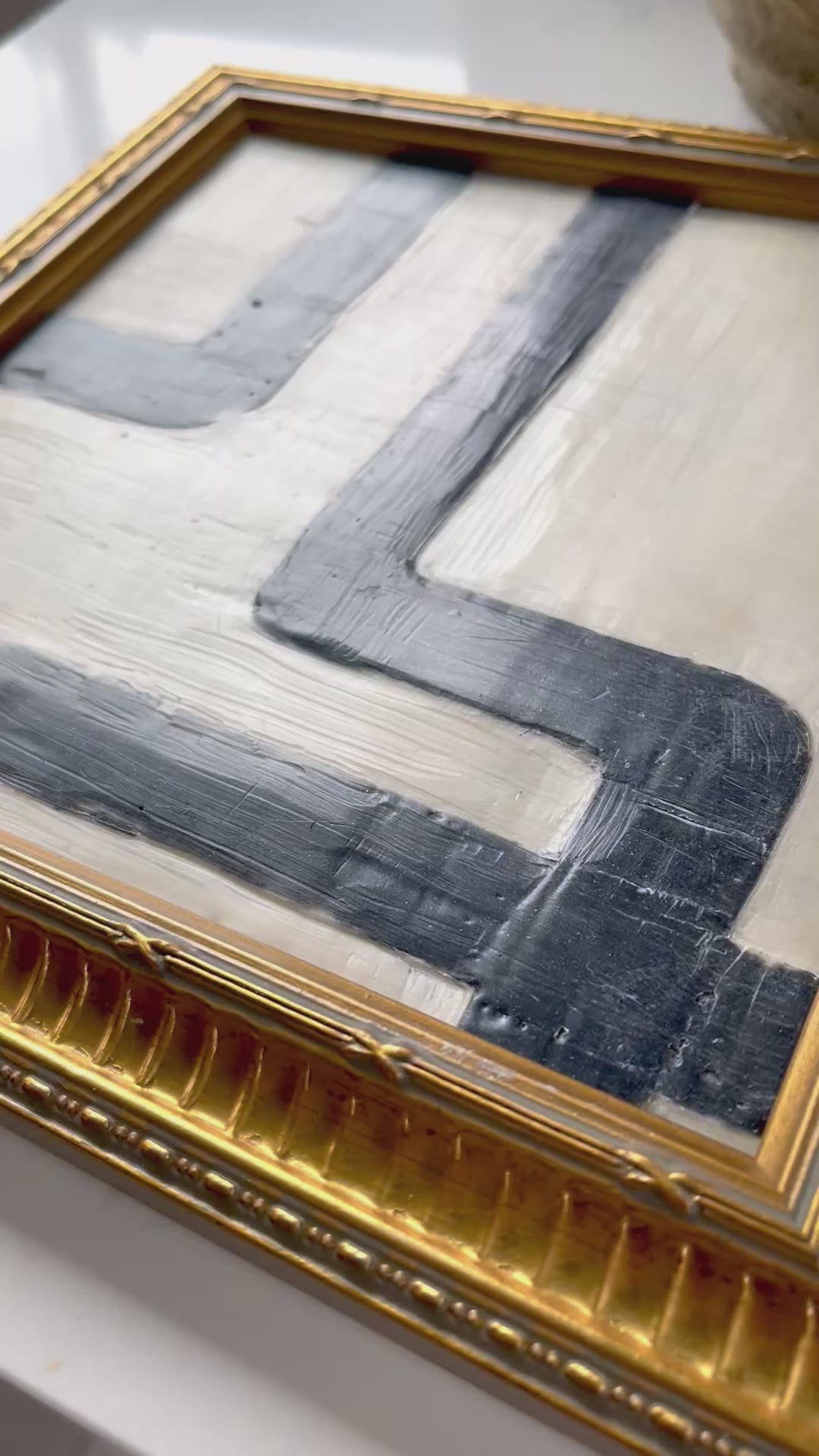 This original 8x8 encaustic wax painting pairs bold, inky-black geometric lines with a warm ivory/cream ground. Presented in a richly detailed ornate gold frame.